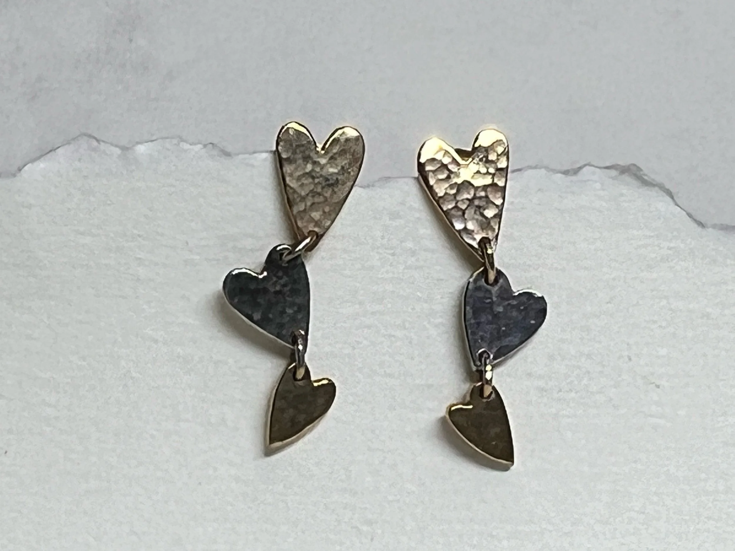 9ct handmade yellow & white GOLD HEART EARRINGS